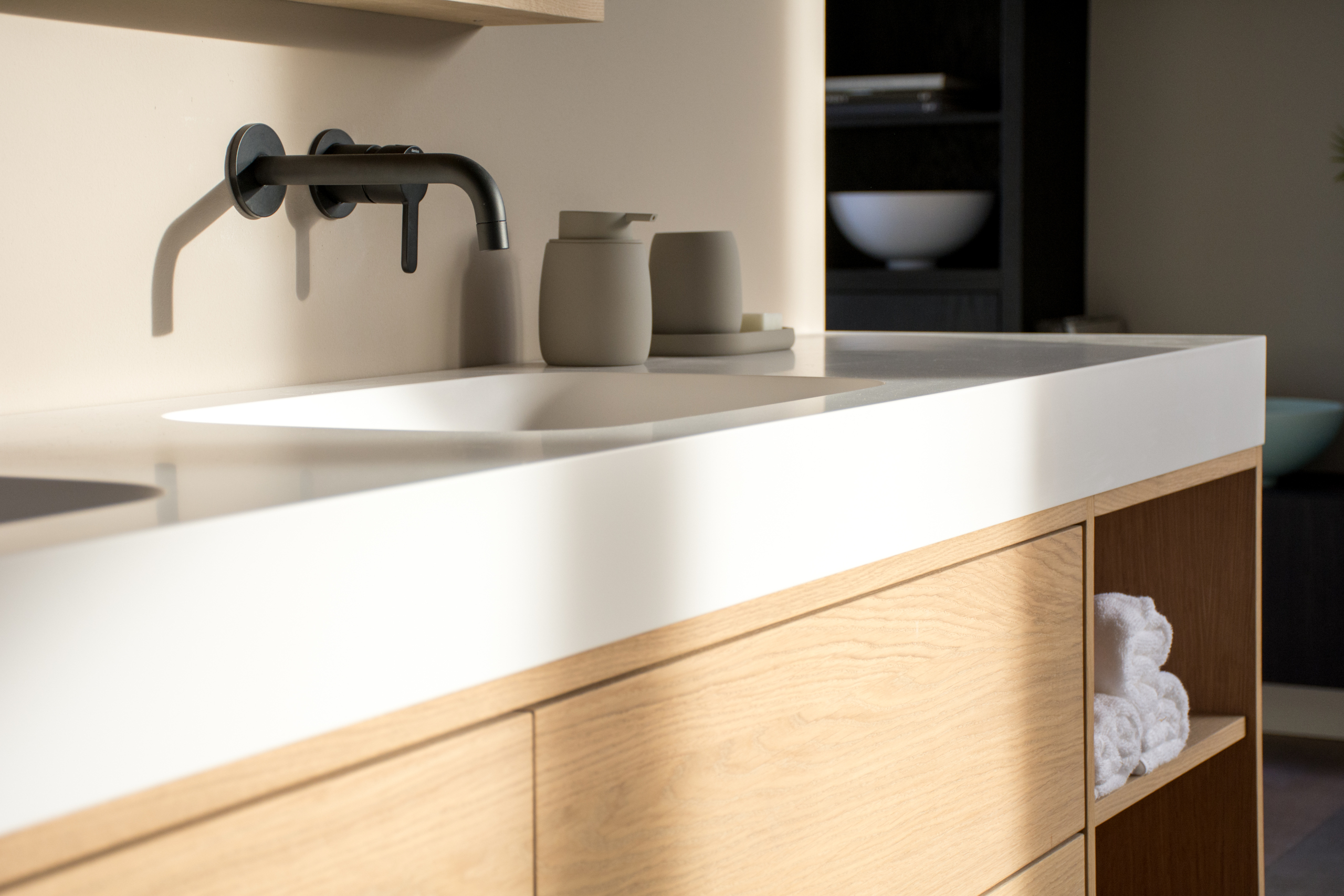 Onze bladen worden vervaardigd uit solid surface, massief eikenhout en eikenfineer op MDF (echt houtfineer). De merken solid surface die we voeren zijn Himacs, Corian, Durasein en Krion. De massief eiken en eikenfineer bladen kunnen in verband met vlekvorming op het blad niet afgewerkt worden met olie. Deze bladen worden altijd gelakt geleverd. Indien de fronten van eiken zijn, worden deze ook blank afgelakt.